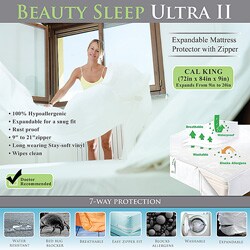 Hypoallergenic Cotton California King-size Expandable to 20-inches Mattress Cover Description : The california king-size hypoallergenic mattress cover will protect against allergens, bed bugs and dust mites. Expandable to 20-inch is suitable for any depth mattress. The cotton upper and soft vinyl is machine washable. Material: Soft vinyl outer cotton Pocket depth: Expandable from 9-21 inches Waterproof Thread count: 300 Breathable Easy zipper fit Machine washable Dimensions: 72 inches x 84 inches x 9-21 inches