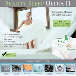 Hypoallergenic Cotton Twin-size Expandable to 20-inches Mattress Cover Description : The standard twin-size hypoallergenic mattress cover will protect against allergens, bed bugs and dust mites. Expandable to 20-inches is suitable for any depth mattress. The cotton upper and soft vinyl is machine washable. Material: Soft vinyl outer cotton Pocket depth: Expandable from 9-20 inches Waterproof Thread count: 300 Breathable Easy zipper fit Machine washable Dimensions: 39 inches x 76 inches x 9-20 inches